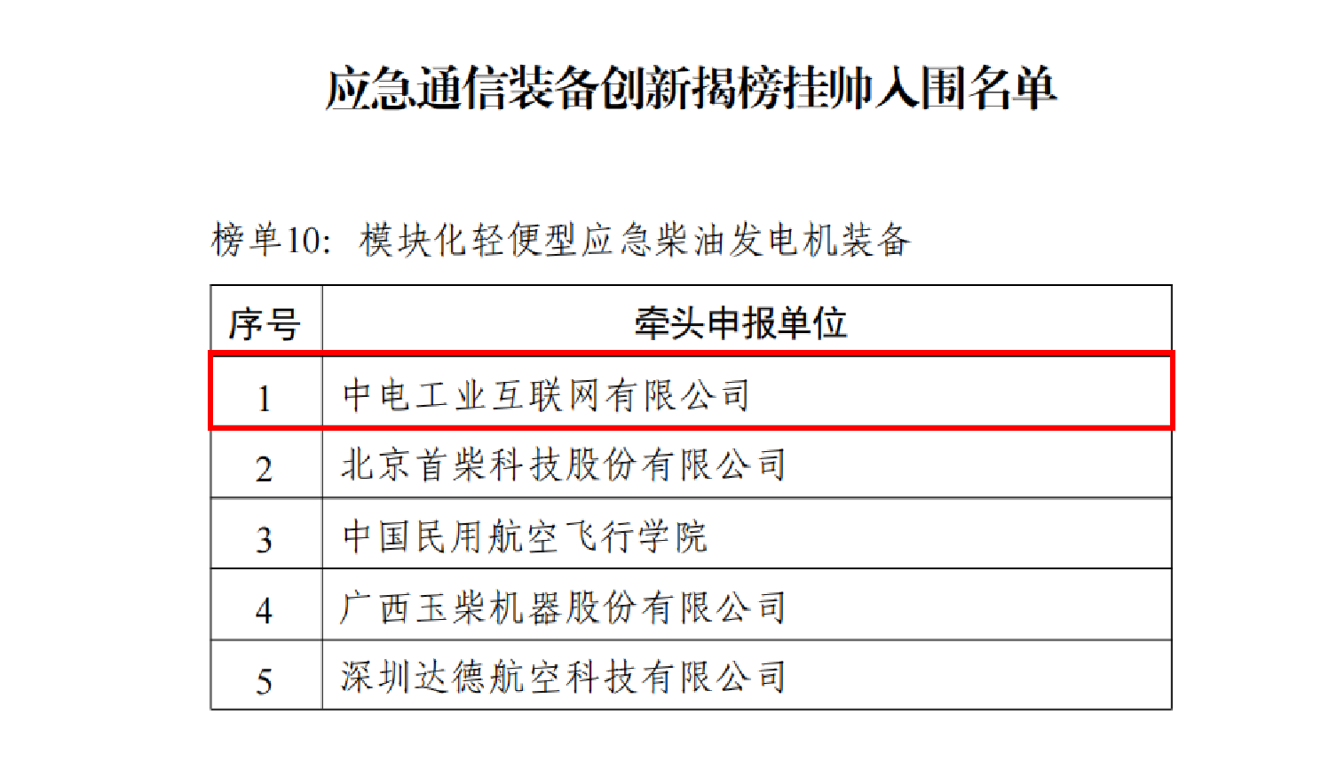 8月12日,工业和信息化部办公厅、应急管理部办公厅联合公布2024年应急通信装备创新揭榜挂帅入围名单。中电工业互联网有限公司(简称中电互联)牵头研发的“模块化轻便型应急柴油发电机装备”成功入选揭榜名单。