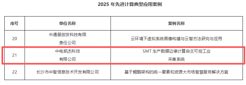 近日,湖南省工业和信息化厅发布了2025年湖南省先进计算、视听系统(音视频)典型应用案例。中电工业互联网有限公司所属中电凯杰科技有限公司(简称中电凯杰)的“SMT生产数据边缘计算自主可控工业采集系统”应用案例获评2025年湖南省先进计算典型应用案例,充分展现了中电凯杰在先进计算领域的技术能力。
