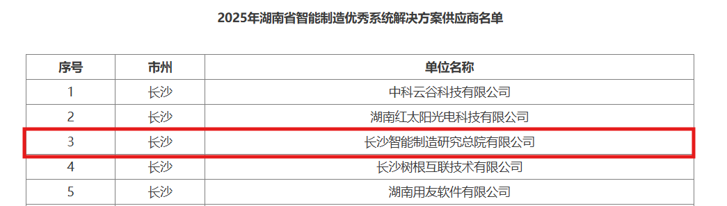 近日,湖南省工业和信息化厅公布了2025年湖南省智能制造优秀系统解决方案供应商名单。中电工业互联网有限公司所属企业长沙智能制造研究总院有限公司(简称长智院)凭借在智能制造顶层设计、系统集成、数字化转型服务等方面的卓越表现,获评湖南省智能制造优秀系统解决方案供应商。